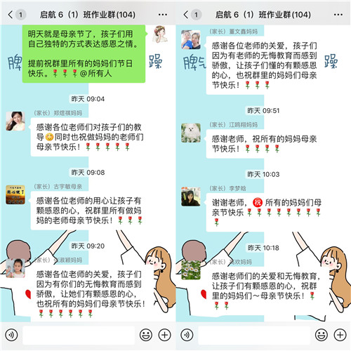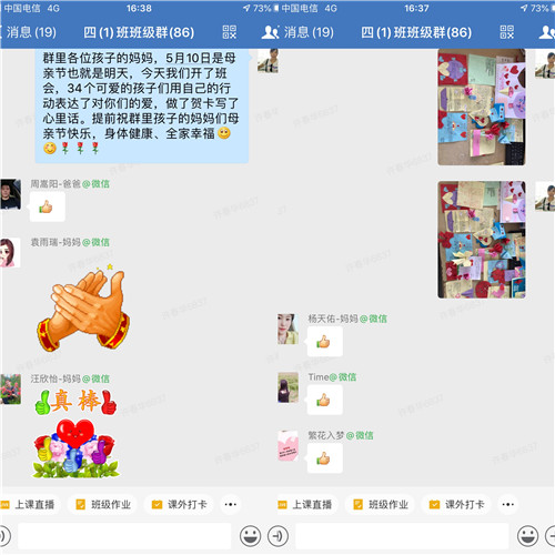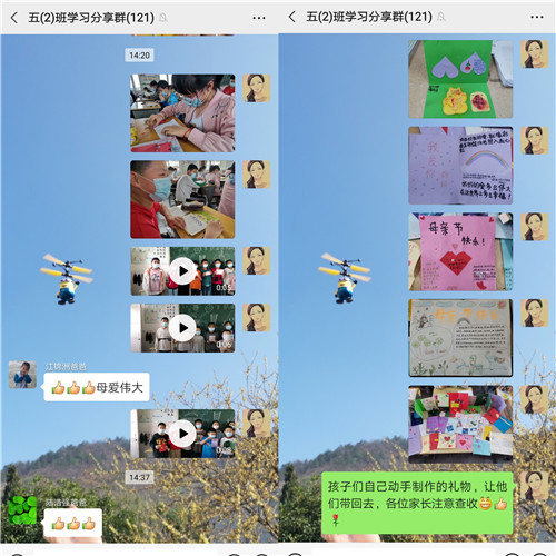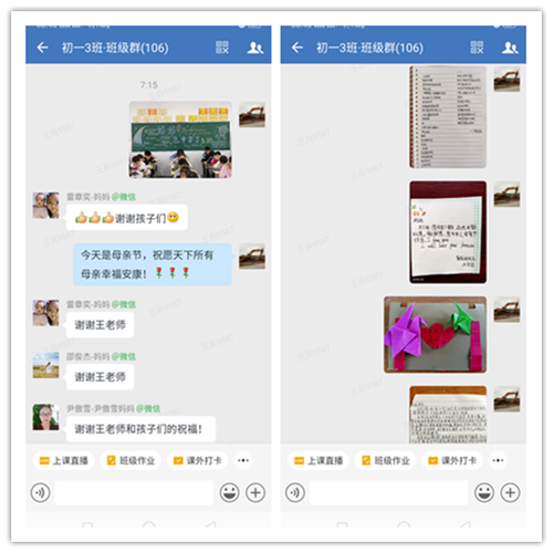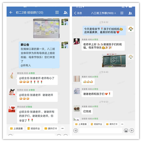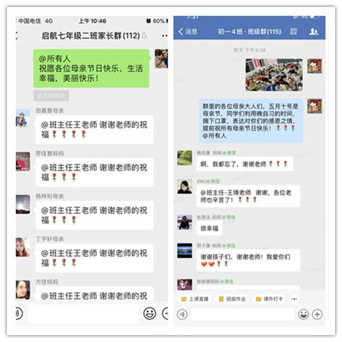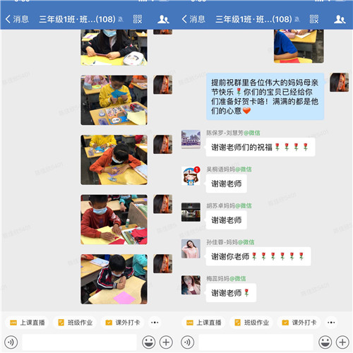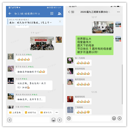 班会课上,有的同学制作贺卡,虽然不是很精美,但是却蕴含着深深的情意;有的同学写着感谢信,那一段段质朴的话语,满载着对母亲的感恩情怀;有的同学则通过歌声表达对母亲的爱和深深地谢意!老师们将这动人的画面记录下,并通过图片和视频的方式发送给学生的家长,传达孩子们浓浓的恩情!