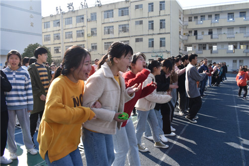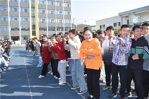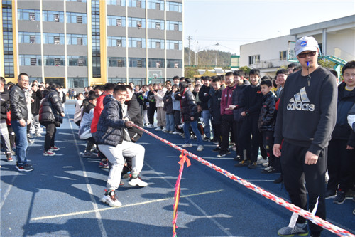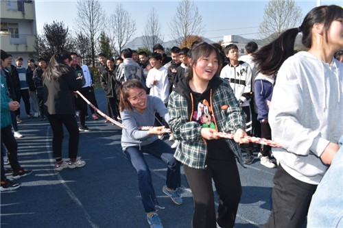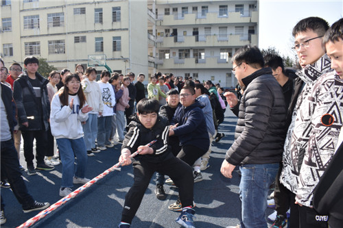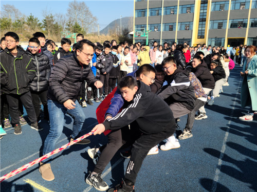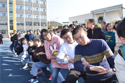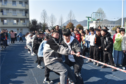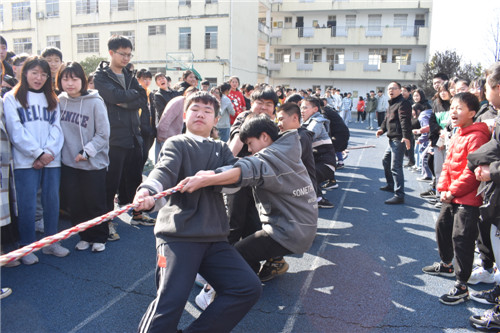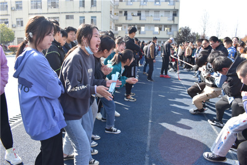 本次拔河比赛按照规定,每班选出男、女生各 8名队员,以班级为单位展开男女生混合竞赛,同时九年级的四位女班主任也参与到了拔河比赛中。比赛先以抽签方式进行初赛,获胜者进入决赛,然后决出名次。随着裁判员一声哨响,振奋人心的拔河比赛开始了!双方队员进入了“战斗”状态,双手紧握五彩拔河绳,双脚用力着地,身体向后微倾,卯足了劲往后拉绳。看!有的同学脸憋得通红却丝毫不放松,有的“面部狰狞”使尽浑身解数,还有的干脆闭上眼睛卯足了劲儿往后拉;女生们也不甘示弱,一个个咬紧牙关,将巾帼不让须眉的精神风貌发扬得淋漓尽致。参赛队员们齐心协力凝成了一股绳!