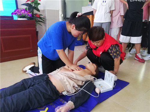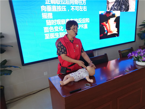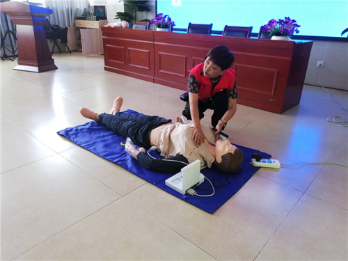 培训中,蔡老师向师生代表们讲解了急救小常识,包括心肺复苏术的步骤、心肺复苏的理论知识、急救方法、救助正确步骤、注意事项等,并进行了动作演练示范。
