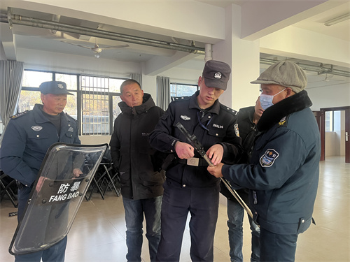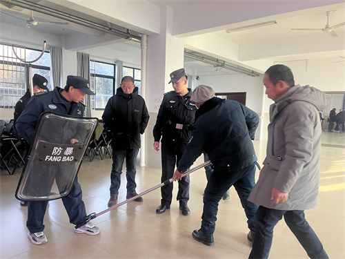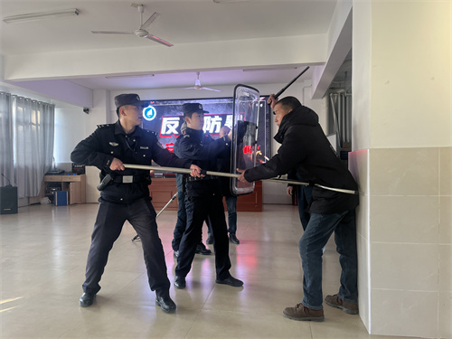 警官们为在场的师生和安保人员讲解防范应对暴恐事件的基本知识,并现场开展了安防应急演练,模拟暴恐事件入侵时的防范应对,练习盾牌、警棍、钢叉等防护器械使用要领,学习针对第一时间发现暴徒,如何报警自护,并将歹徒制服。