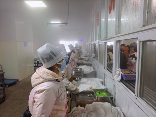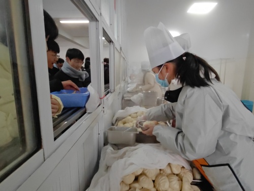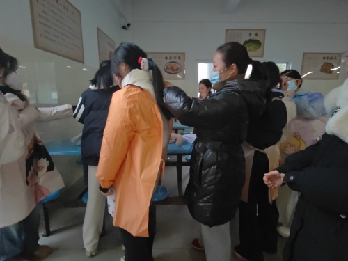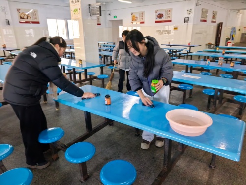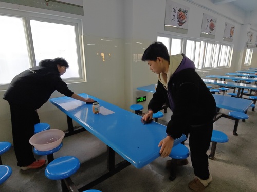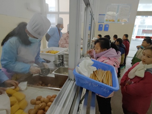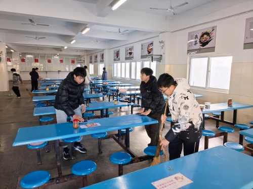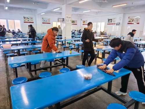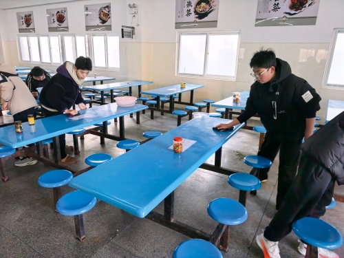 八年级的同学们则承担起售卖和打扫卫生的任务。售卖区前,洗手消毒并佩戴好手套和口罩的他们,熟练地为同学们打早餐,还不忘贴心叮嘱“小心烫手”。用餐结束后,大家迅速切换成“清洁小分队”,拿起抹布、扫帚和盆,分工清理餐桌油污、收拾餐盘碗筷、打扫地面残渣,大家齐心协力,让食堂很快恢复了整洁清爽的模样。