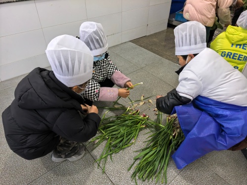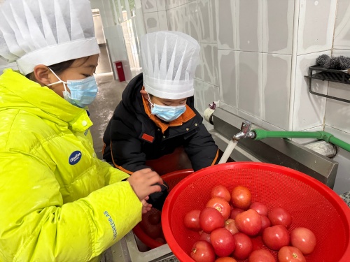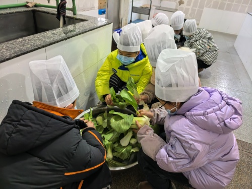 活动中,四年级的同学们化身“洗菜小卫士”,在食堂工作人员的指导下有序忙碌。他们围在水槽和水盆边,认真择去青菜和大蒜上的黄叶和老根,再捧着菜苗反复冲洗,不放过一点泥沙。面对滑溜溜的海带、圆滚滚的西红柿,同学们认真清洗,稚嫩的脸上满是专注。虽然衣袖被溅起的水花打湿,小手也浸得有些发红,但看着一盆盆干净的蔬菜被端走,大家的脸上都扬起了自豪的笑容。