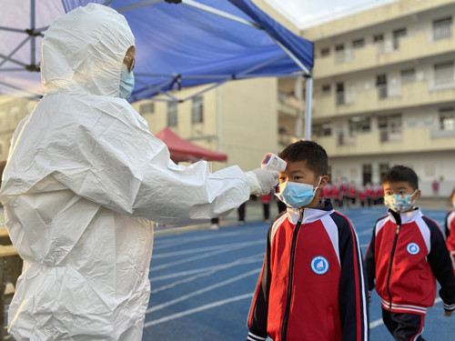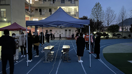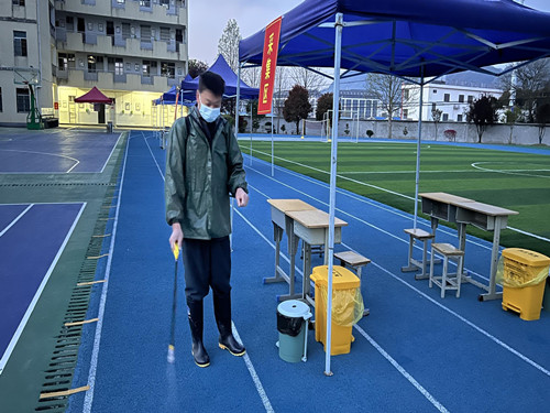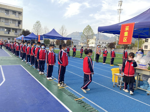 4月6日早上五点半,消毒人员对演练场所进行全方位、无死角消毒。六点钟,演练按照预定计划开始,各班级学生由班主任带队,在学校志愿者的引导下,严格按照一米线、不聚集到原则,戴好口罩,依次经过测温、信息登记、采样等区域,有序进行采样,由于学校准备充分,加上班主任又通过班会提前做了周密部署,整个演练过程井然有序。