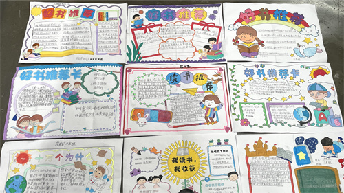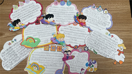 低年级的孩子们手执画笔,精心制作读书卡,内容丰富、色彩斑斓。有的同学工整摘抄好词佳句,积累语言素材;有的同学认真书写阅读感悟,分享自己的所思所想。
